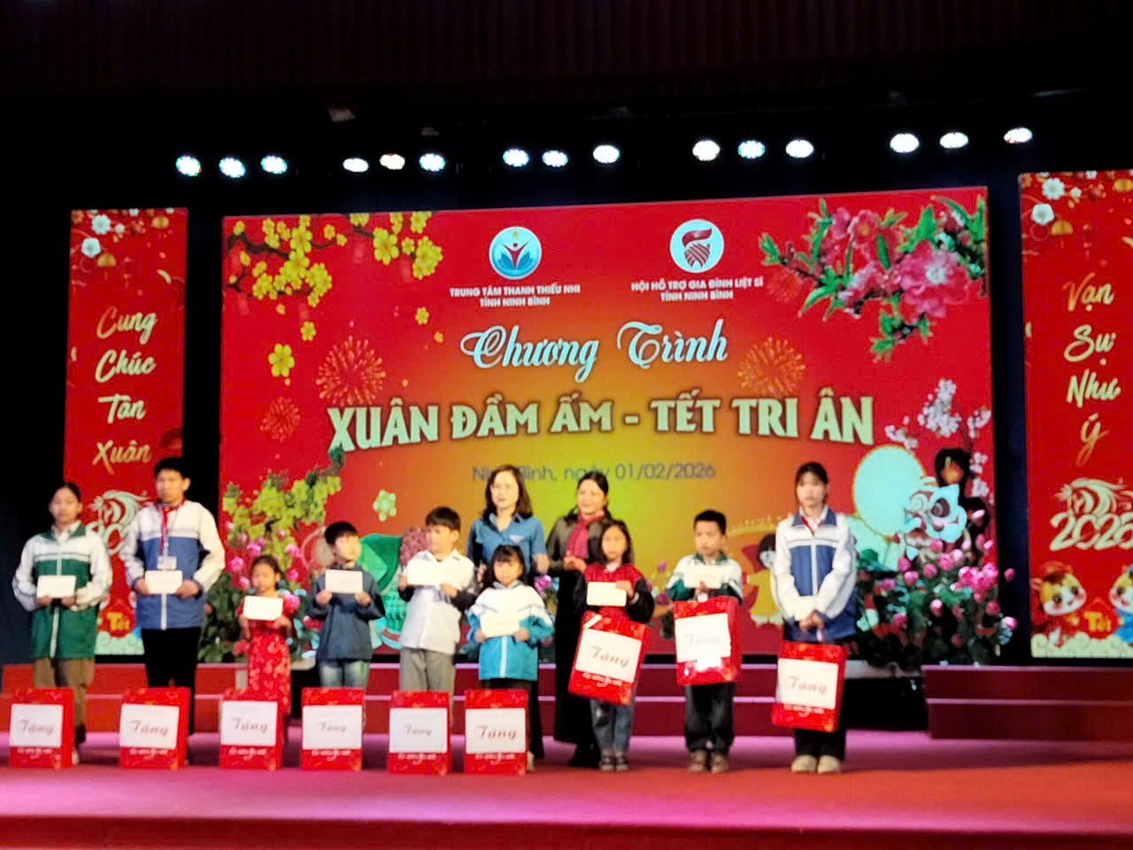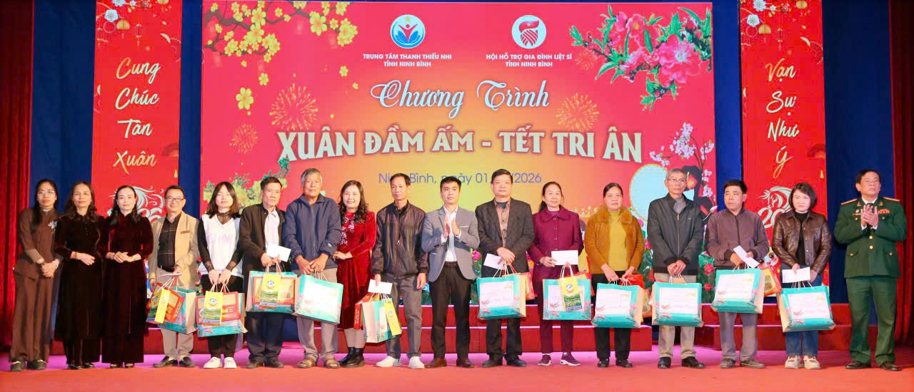 Trước đó, Lãnh đạo nhà trường cũng đã phối hợp với Trung tâm TTN tỉnh, Hội hỗ trợ GĐLS tỉnh trao tặng 08 xuất quà, mỗi xuất trị giá 500.000 đồng cho thân nhân các gia đình liệt sỹ có hoàn cảnh khó khăn trên địa bàn tỉnh và 01 em HS có hoàn cảnh khó khăn của nhà trường cũng được nhận phần quà hỗ trợ từ chương trình “Xuân đầm ấm – Tết tri ân” do TT TTN tỉnh và Hội HT GĐLS tỉnh phối hợp tổ chức; Quà từ chương trình An sinh xã hội do ngân hàng Agribank phối hợp với Đoàn thanh niên phường Tây Hoa Lư tổ chức (03 HS).