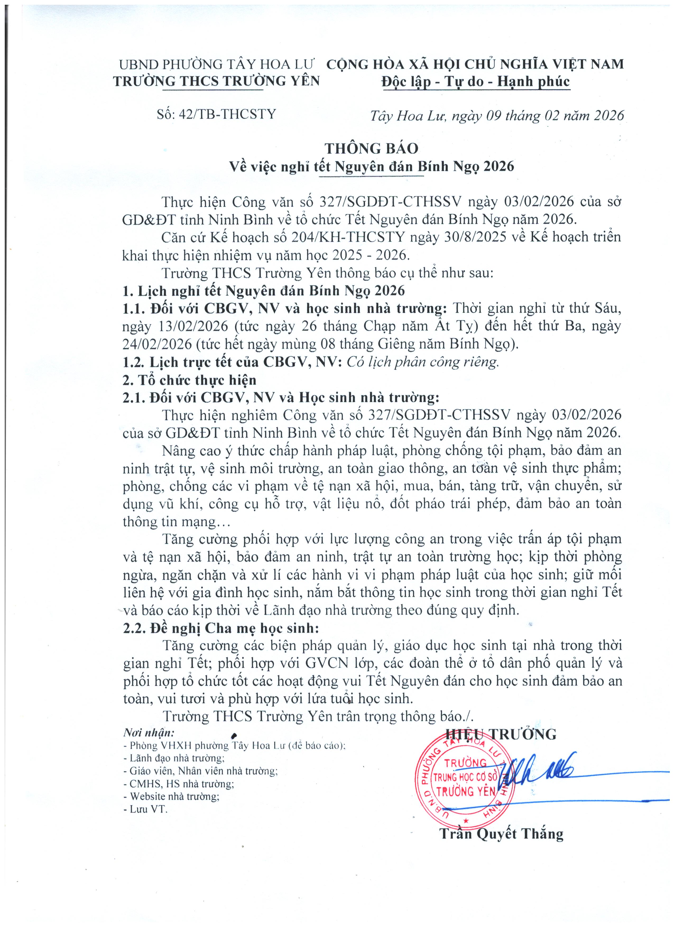 • 31/BC-THCSTY (21/01/2026) - Về việc thực hiện các khoản thu dịch vụ phục vụ, hỗ trợ hoạt động giáo dục theo Nghị quyết số 30/2025/NQ-HĐND ngày 09/12/2025 của HĐND tỉnh Ninh Bình trong HKII năm học 2025 - 2026